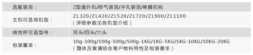 该机组由一台线性秤、一台卷膜制袋包装机、平台等样袋组成。主要用于化工、粮食、种子行业如玉米、大米、洗衣粉等颗粒物料,能完成产品的自动计量包装,并可搭配重量选别机,金属检测机等实现自动复检的功能。该机组广泛应用于杂粮行业、日化、五金等行业,