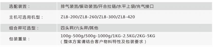 该机组由一台线性秤、一台旋转给袋包装机组样袋成,搭配多斗提升机,完成自动包装的流程。适用于各种颗粒状、条块状等物料的称重。如小米、鹰嘴豆、大米、各种豆类、鱼饵、宠物食品、各类休闲食品类物料等。机器可实现自动称重、充填、封口、打码、输送等功能。