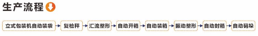 该装箱线对接全自动制袋包装机、全自动给袋包装机,包含自动开箱机、自动装箱机、自动捆扎机、自动码垛机器人等。是将成品袋装产品有序装入纸箱并对纸箱进行码垛的过程。方案设计须要根据客户袋子尺寸、重量、纸箱尺寸、产能进行设计。